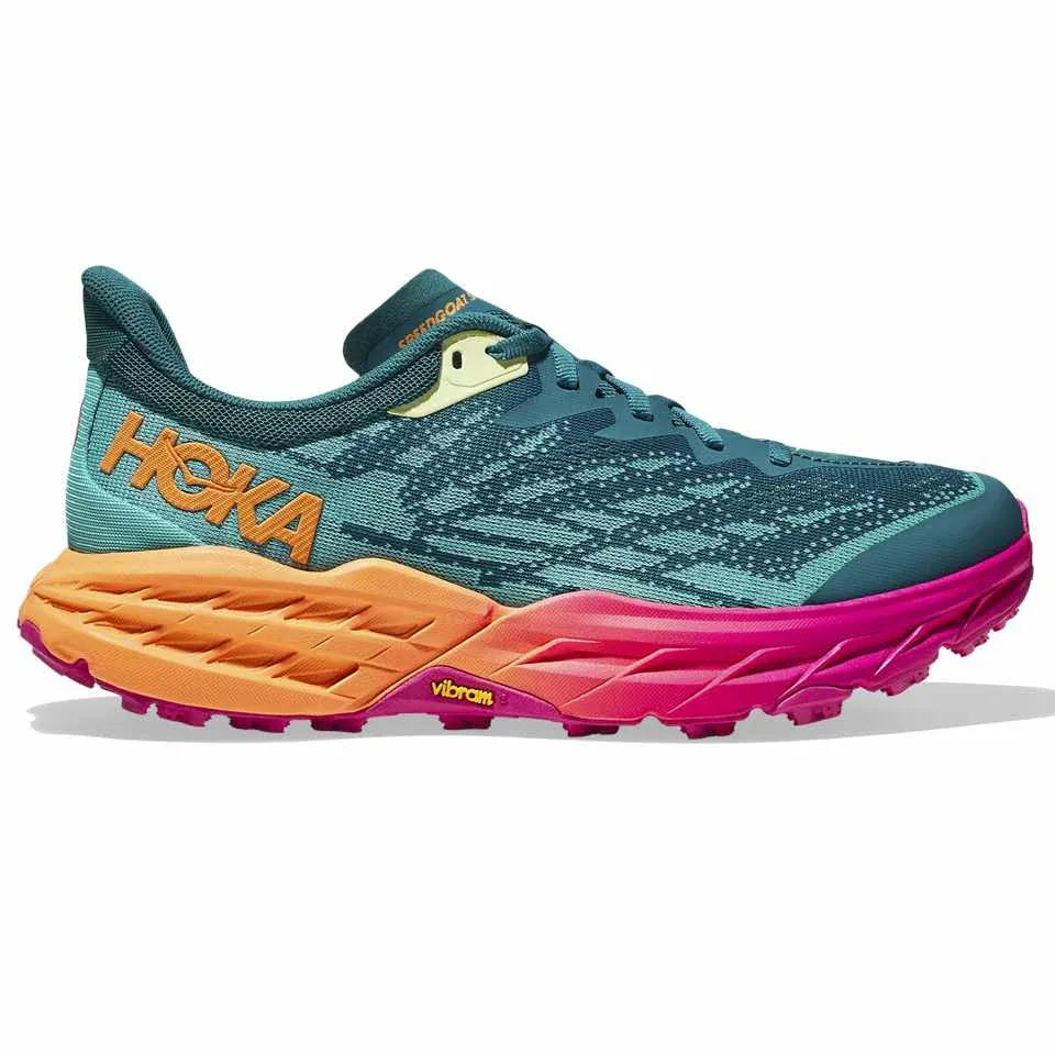 De Speedgoat is een werkpaard ontwikkeld voor technische paden en keert terug met minder gewicht en meer grip dan ooit tevoren. Volledig vernieuwd van de buitenzool tot de veters. Deze schoen is een beest op de paden en deze update heeft Vibram® Megagrip met Traction Lug voor betere grip op losse ondergrond. De stapelhoogte en het rockerprofiel (de rondere zool) zijn behouden gebleven, maar de Speedgoat 5 heeft een lichtere middenzoolconstructie en biedt dankzij steviger, dubbellaags geweven mesh meer vertrouwen op ieder terrein.