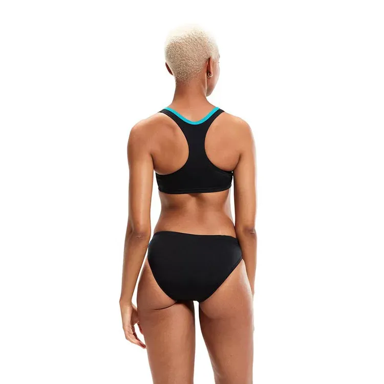 Het Speedo bikini dames Placement Eco Endurance+ zwart & blauw is een sportieve bikini heeft een racerback rug voor flexibiliteit tijdens uw training. Het broekje is voorzien van een trekkoord in de tailleband voor extra comfort en zekerheid. Het is vervaardigd met ECO Endurance+, wat chloorbestendig is, sneldrogend en gemaakt uit 50% gerecycled materiaal. Ideaal voor dagelijks gebruik. Deze bikini is zeer geschikt voor het stand en vrijetijd en heeft een medium beenuitsnijding. Wij hanteren de DUITSE maatvoering. KAN NIET GERUILD WORDEN I.V.M. HOGE KORTING.